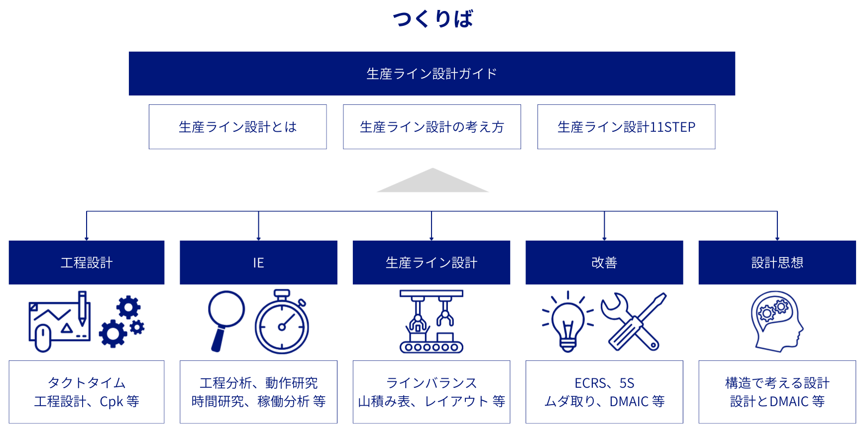 つくりばは『感覚に頼らない生産ライン設計』をテーマに、生産ライン設計を体系的に理解できるように構成しています。