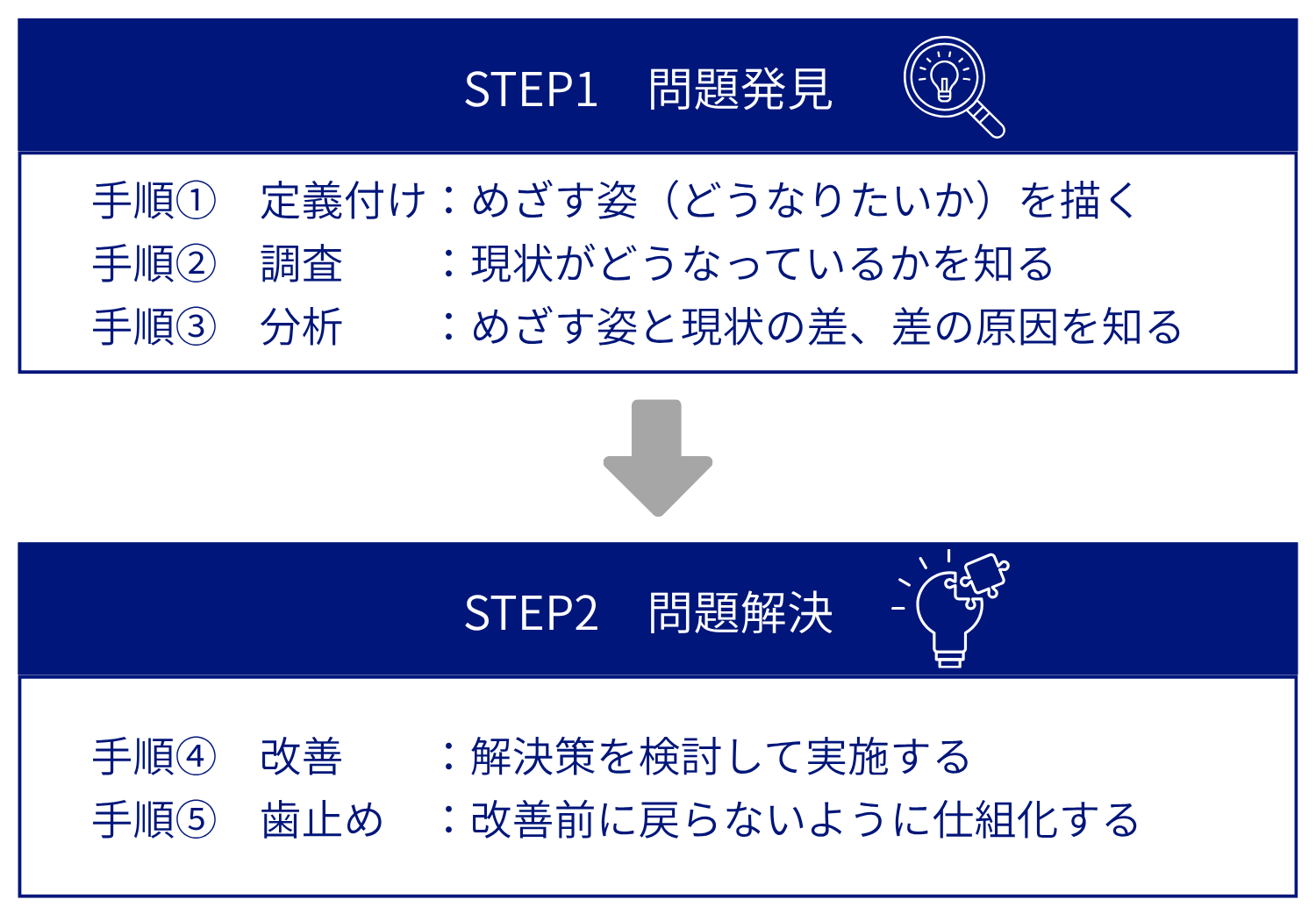 改善を進める際の大きな流れは、①問題発見、②問題解決、の2点で、以下の内容を進めていきます。