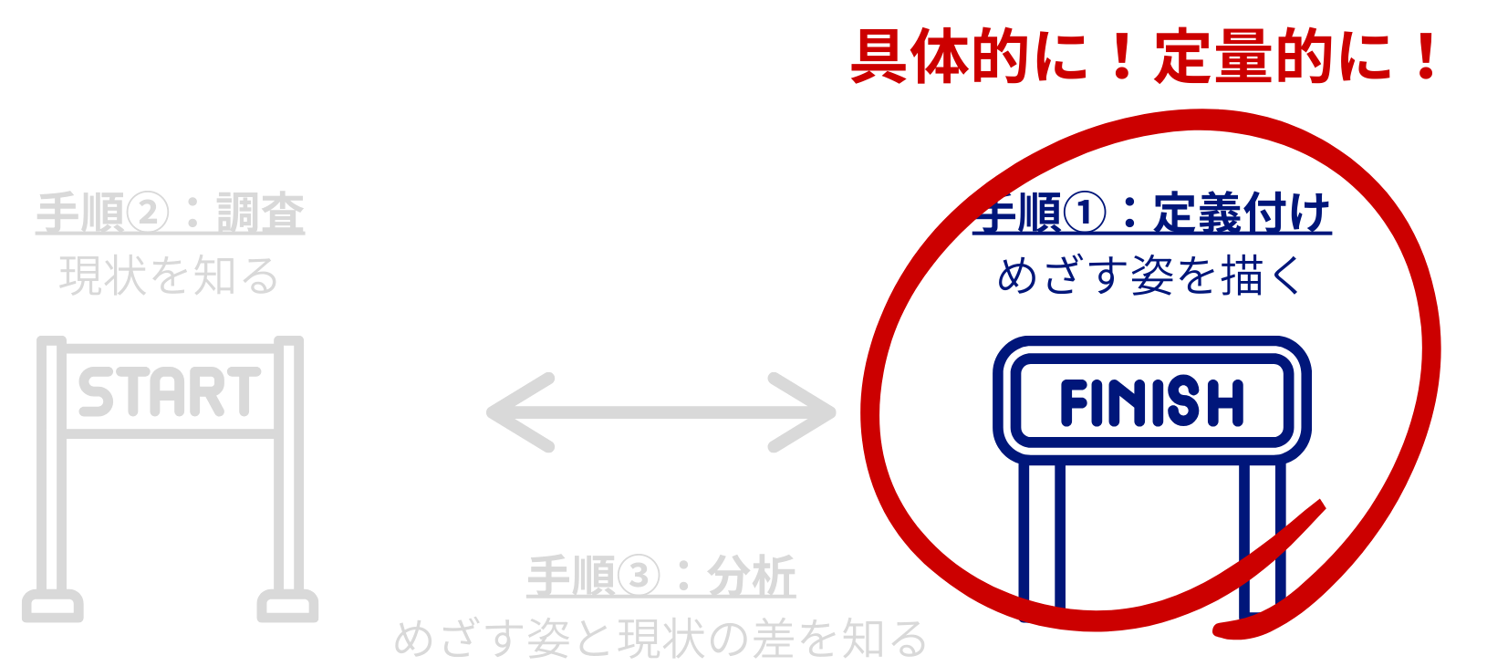 まずは①定義付けです。 問題発見 定義付け 目指す姿(ビジョン)確認(目的)