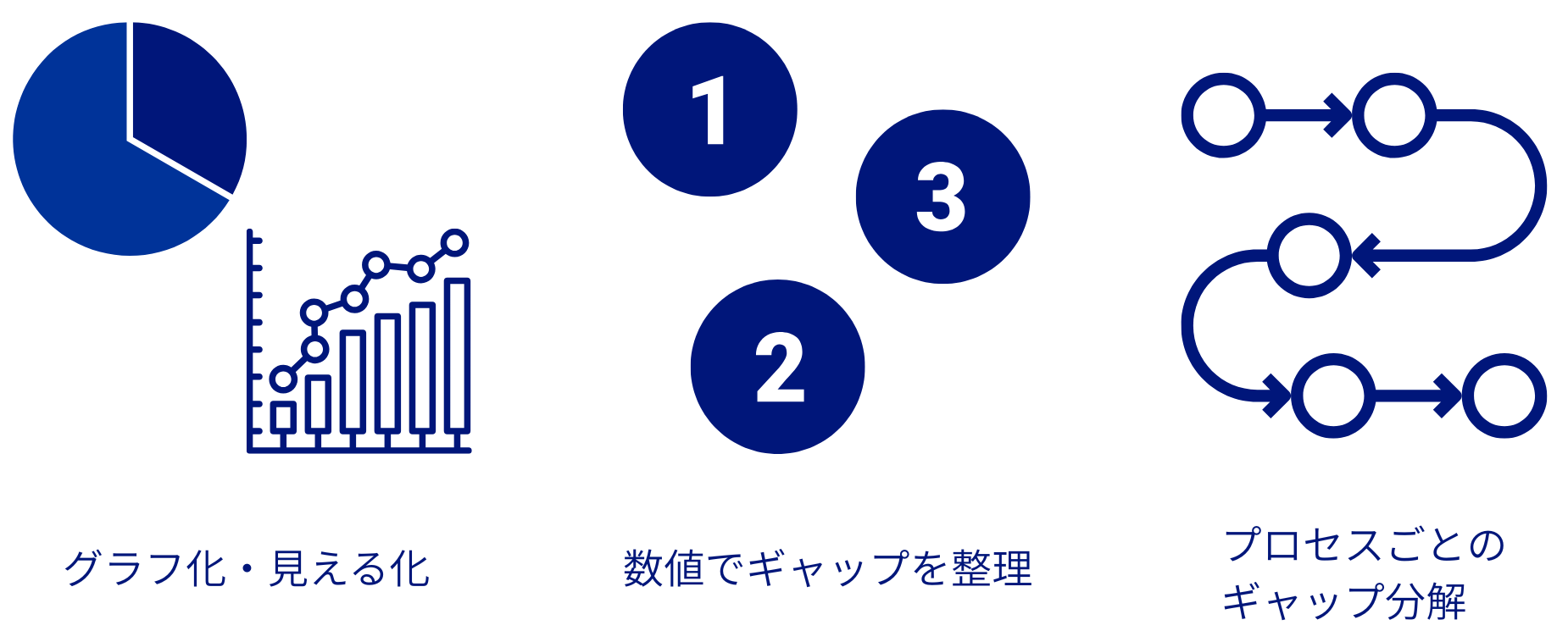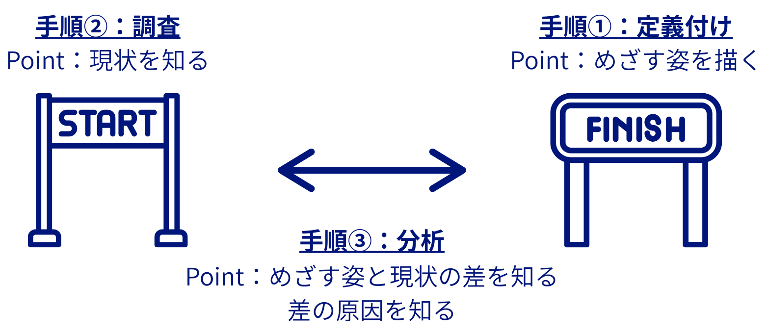 問題発見のフェーズでは『目指す方向・目的を明確にして、それに対する問題・原因を把握する』とお伝えしましたが、具体的には以下の3点を進めます。